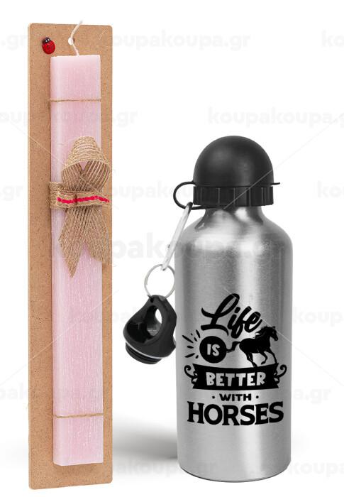 Life is Better with a Horses, Πασχαλινή Λαμπάδα με παγούρι μεταλλικό Ασημένιο αλουμινίου (500ml) & κερί αρωματικό πλακέ (30cm) (ΡΟΖ)
