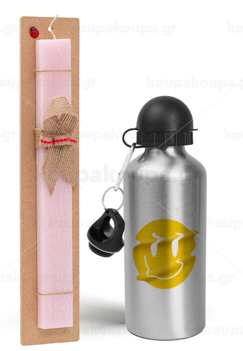 Smile avatar distrorted, Πασχαλινή Λαμπάδα με παγούρι μεταλλικό Ασημένιο αλουμινίου (500ml) & κερί αρωματικό πλακέ (30cm) (ΡΟΖ)