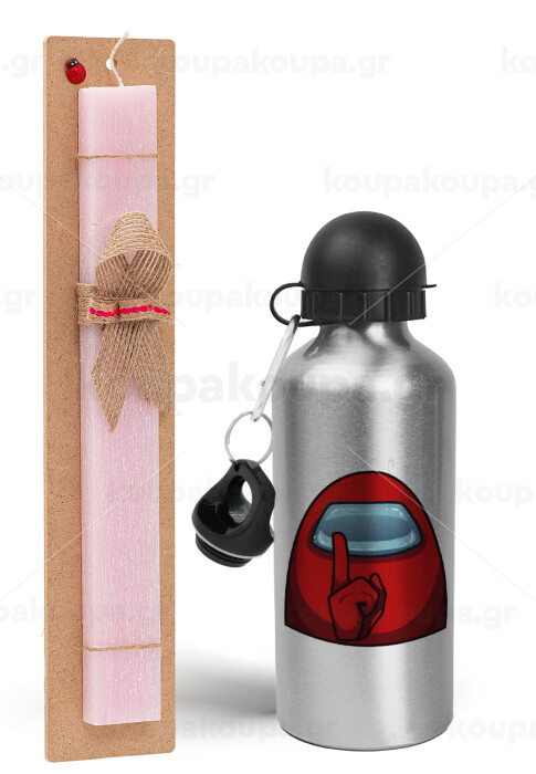 Among US, Πασχαλινή Λαμπάδα με παγούρι μεταλλικό Ασημένιο αλουμινίου (500ml) & κερί αρωματικό πλακέ (30cm) (ΡΟΖ)