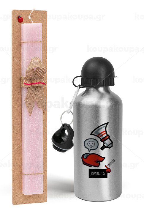 Among US Shhhh!!!, Πασχαλινή Λαμπάδα με παγούρι μεταλλικό Ασημένιο αλουμινίου (500ml) & κερί αρωματικό πλακέ (30cm) (ΡΟΖ)