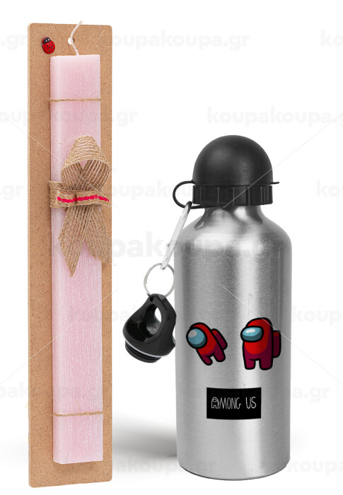 Among US, Πασχαλινή Λαμπάδα με παγούρι μεταλλικό Ασημένιο αλουμινίου (500ml) & κερί αρωματικό πλακέ (30cm) (ΡΟΖ)