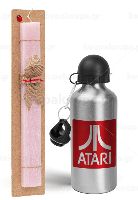 atari, Πασχαλινή Λαμπάδα με παγούρι μεταλλικό Ασημένιο αλουμινίου (500ml) & κερί αρωματικό πλακέ (30cm) (ΡΟΖ)