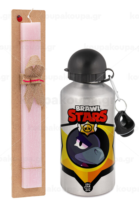 Brawl Stars Crow, Πασχαλινή Λαμπάδα με παγούρι μεταλλικό Ασημένιο αλουμινίου (500ml) & κερί αρωματικό πλακέ (30cm) (ΡΟΖ)