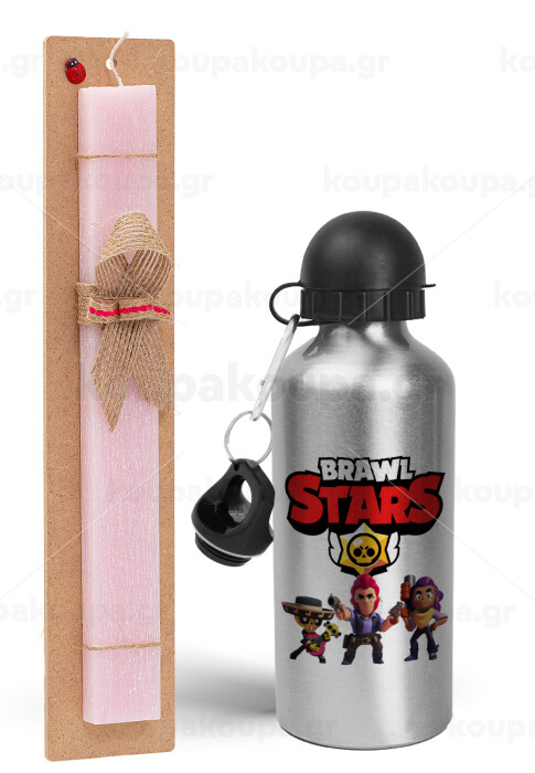 Brawl Stars Desert, Πασχαλινή Λαμπάδα με παγούρι μεταλλικό Ασημένιο αλουμινίου (500ml) & κερί αρωματικό πλακέ (30cm) (ΡΟΖ)