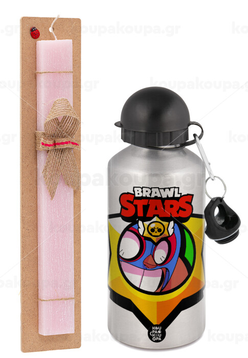 Brawl Stars El primo, Πασχαλινή Λαμπάδα με παγούρι μεταλλικό Ασημένιο αλουμινίου (500ml) & κερί αρωματικό πλακέ (30cm) (ΡΟΖ)