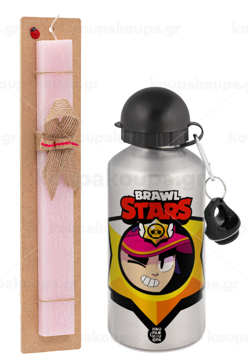 Brawl Stars Fang, Πασχαλινή Λαμπάδα με παγούρι μεταλλικό Ασημένιο αλουμινίου (500ml) & κερί αρωματικό πλακέ (30cm) (ΡΟΖ)