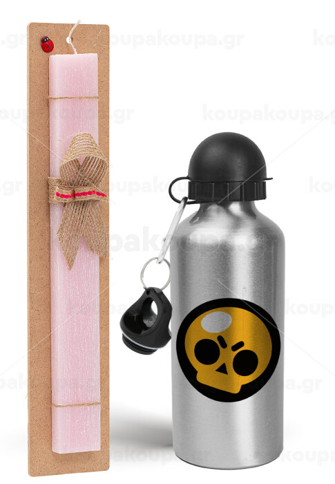 Brawl Stars Skull, Πασχαλινή Λαμπάδα με παγούρι μεταλλικό Ασημένιο αλουμινίου (500ml) & κερί αρωματικό πλακέ (30cm) (ΡΟΖ)