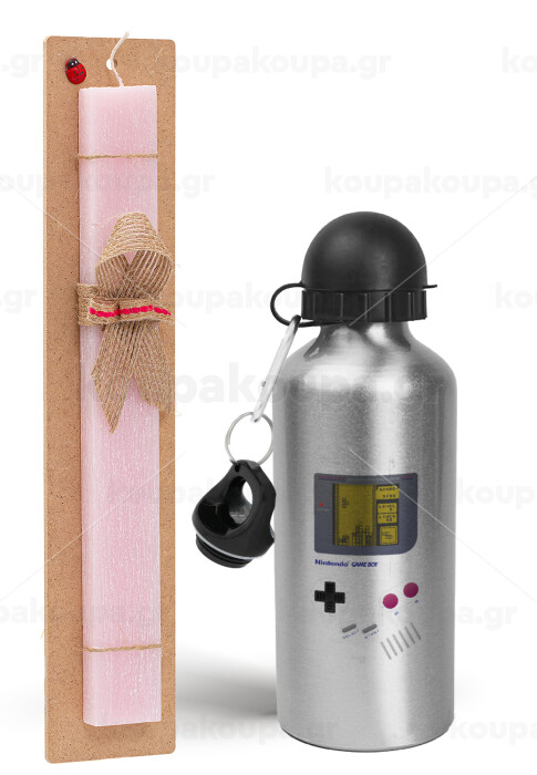 Gameboy, Πασχαλινή Λαμπάδα με παγούρι μεταλλικό Ασημένιο αλουμινίου (500ml) & κερί αρωματικό πλακέ (30cm) (ΡΟΖ)