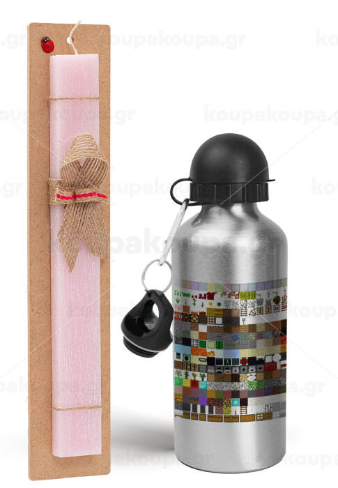Minecraft blocks, Πασχαλινή Λαμπάδα με παγούρι μεταλλικό Ασημένιο αλουμινίου (500ml) & κερί αρωματικό πλακέ (30cm) (ΡΟΖ)