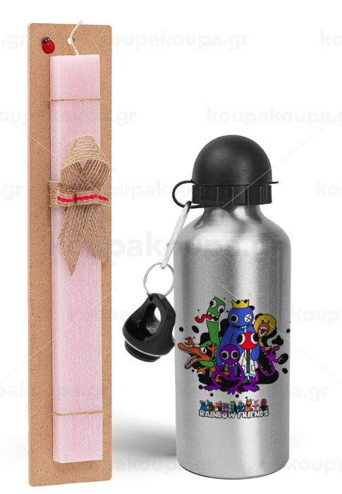 Rainbow friends, Πασχαλινή Λαμπάδα με παγούρι μεταλλικό Ασημένιο αλουμινίου (500ml) & κερί αρωματικό πλακέ (30cm) (ΡΟΖ)
