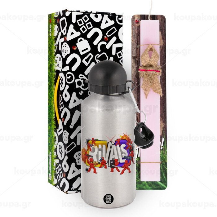 Roblox Rivals, Πασχαλινή Λαμπάδα με παγούρι μεταλλικό Ασημένιο αλουμινίου (500ml) & κερί αρωματικό πλακέ (30cm) (ΡΟΖ)