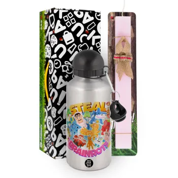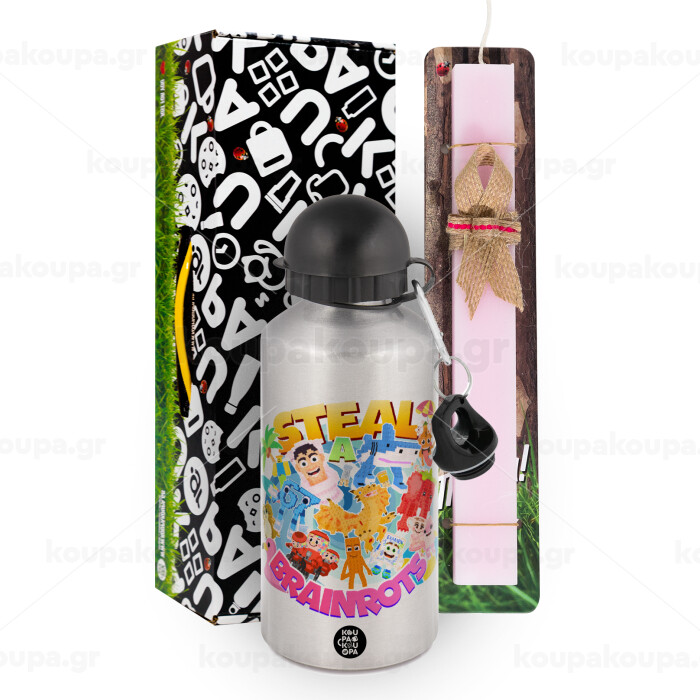 Roblox Steal a Brainrot, Πασχαλινή Λαμπάδα με παγούρι μεταλλικό Ασημένιο αλουμινίου (500ml) & κερί αρωματικό πλακέ (30cm) (ΡΟΖ)