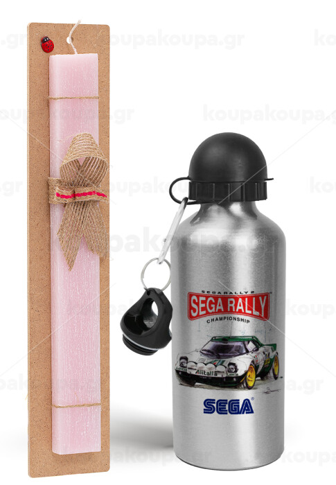 SEGA RALLY 2, Πασχαλινή Λαμπάδα με παγούρι μεταλλικό Ασημένιο αλουμινίου (500ml) & κερί αρωματικό πλακέ (30cm) (ΡΟΖ)