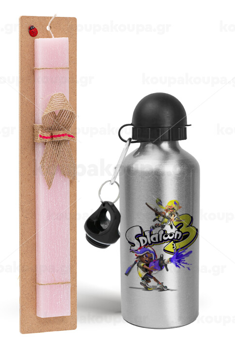 Splatoon 3, Πασχαλινή Λαμπάδα με παγούρι μεταλλικό Ασημένιο αλουμινίου (500ml) & κερί αρωματικό πλακέ (30cm) (ΡΟΖ)
