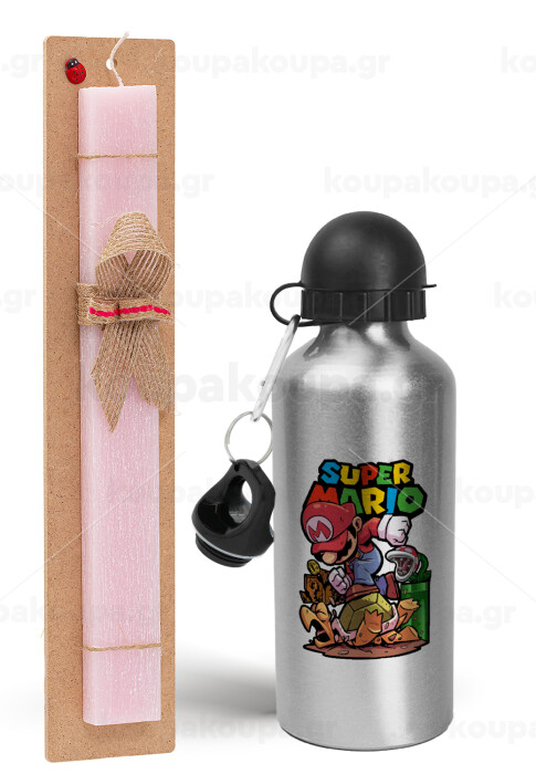 Super mario Jump, Πασχαλινή Λαμπάδα με παγούρι μεταλλικό Ασημένιο αλουμινίου (500ml) & κερί αρωματικό πλακέ (30cm) (ΡΟΖ)