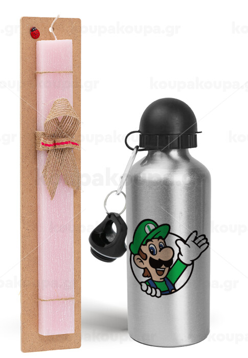 Super mario Luigi win, Πασχαλινή Λαμπάδα με παγούρι μεταλλικό Ασημένιο αλουμινίου (500ml) & κερί αρωματικό πλακέ (30cm) (ΡΟΖ)