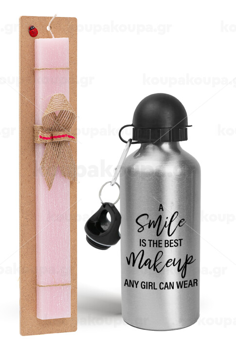 A slime is the best makeup any girl can wear, Πασχαλινή Λαμπάδα με παγούρι μεταλλικό Ασημένιο αλουμινίου (500ml) & κερί αρωματικό πλακέ (30cm) (ΡΟΖ)