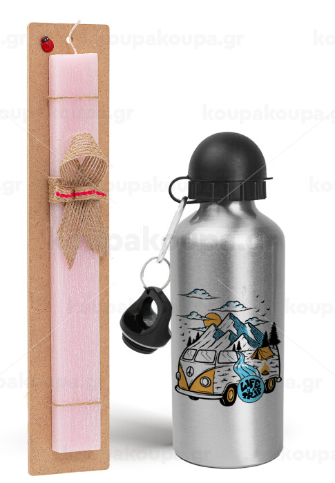 Life is a trip, Πασχαλινή Λαμπάδα με παγούρι μεταλλικό Ασημένιο αλουμινίου (500ml) & κερί αρωματικό πλακέ (30cm) (ΡΟΖ)