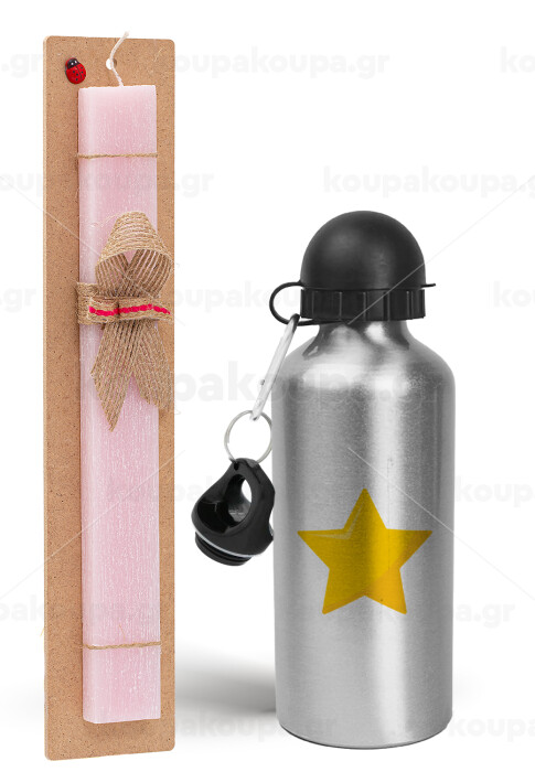 Star, Πασχαλινή Λαμπάδα με παγούρι μεταλλικό Ασημένιο αλουμινίου (500ml) & κερί αρωματικό πλακέ (30cm) (ΡΟΖ)