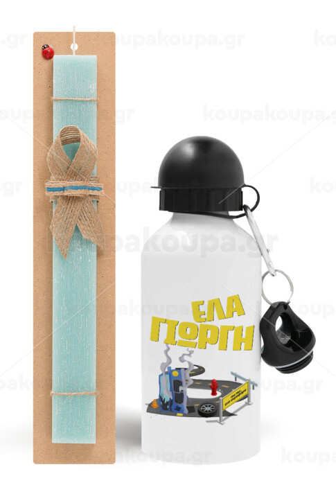 Έλα Γιώργη, πω πω μια στροφάρα, Πασχαλινή Λαμπάδα με παγούρι μεταλλικό αλουμινίου (500ml) & λαμπάδα αρωματική πλακέ (30cm) (ΤΙΡΚΟΥΑΖ)