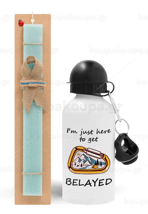 I'm just here to get Belayed, Πασχαλινή Λαμπάδα με παγούρι μεταλλικό αλουμινίου (500ml) & λαμπάδα αρωματική πλακέ (30cm) (ΤΙΡΚΟΥΑΖ)