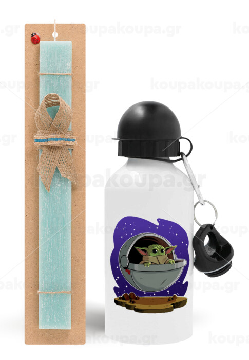Baby Yoda mandalorian, Πασχαλινή Λαμπάδα με παγούρι μεταλλικό αλουμινίου (500ml) & λαμπάδα αρωματική πλακέ (30cm) (ΤΙΡΚΟΥΑΖ)