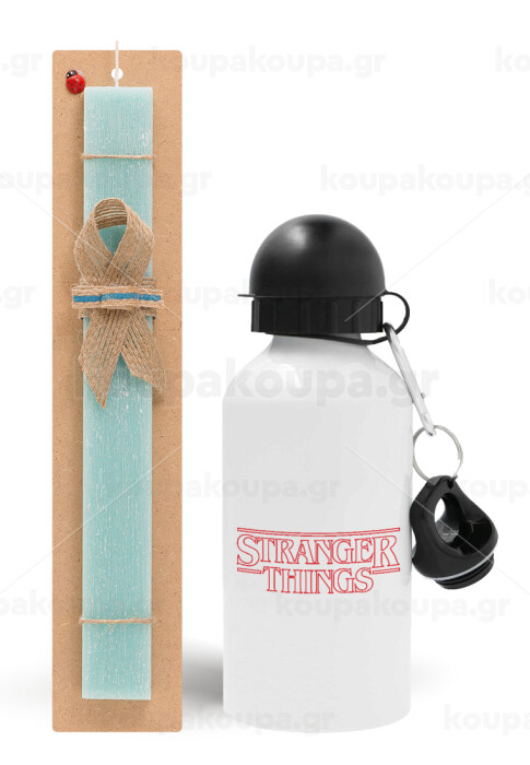 Stranger Things Logo, Πασχαλινή Λαμπάδα με παγούρι μεταλλικό αλουμινίου (500ml) & λαμπάδα αρωματική πλακέ (30cm) (ΤΙΡΚΟΥΑΖ)
