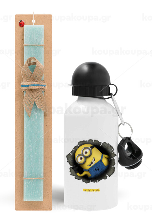 Minions hi, Πασχαλινή Λαμπάδα με παγούρι μεταλλικό αλουμινίου (500ml) & λαμπάδα αρωματική πλακέ (30cm) (ΤΙΡΚΟΥΑΖ)