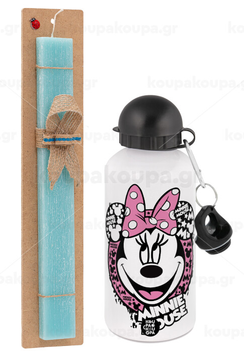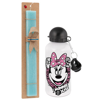 Minnie mouse, Πασχαλινή Λαμπάδα με παγούρι μεταλλικό αλουμινίου (500ml) & λαμπάδα αρωματική πλακέ (30cm) (ΤΙΡΚΟΥΑΖ)
