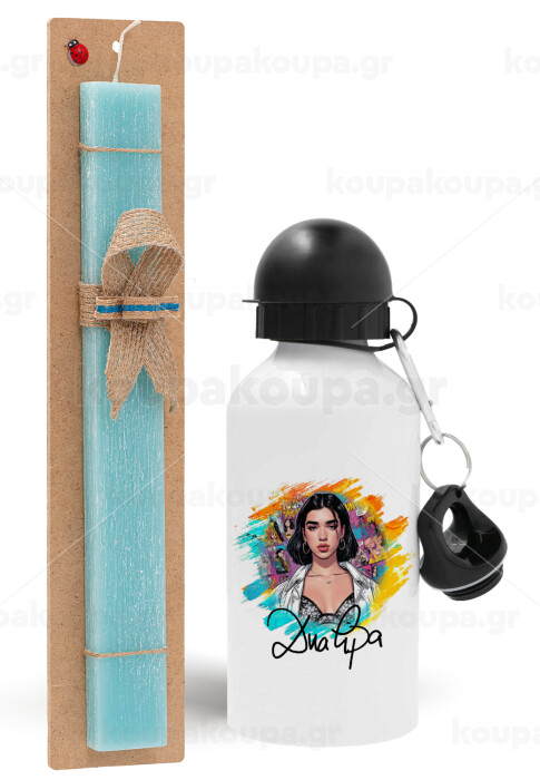 Dua lipa, Πασχαλινή Λαμπάδα με παγούρι μεταλλικό αλουμινίου (500ml) & λαμπάδα αρωματική πλακέ (30cm) (ΤΙΡΚΟΥΑΖ)