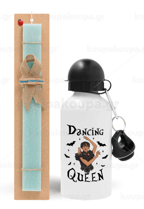 Wednesday Addams Dance, Πασχαλινή Λαμπάδα με παγούρι μεταλλικό αλουμινίου (500ml) & λαμπάδα αρωματική πλακέ (30cm) (ΤΙΡΚΟΥΑΖ)