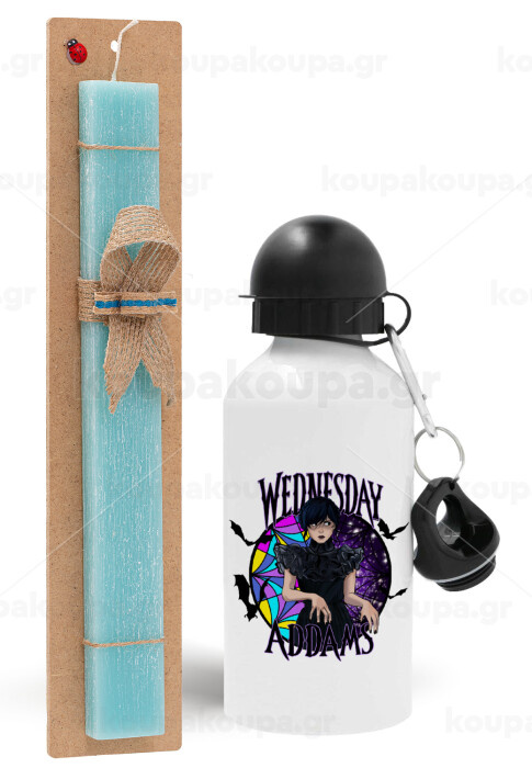 Wednesday Jenna Ortega, Πασχαλινή Λαμπάδα με παγούρι μεταλλικό αλουμινίου (500ml) & λαμπάδα αρωματική πλακέ (30cm) (ΤΙΡΚΟΥΑΖ)