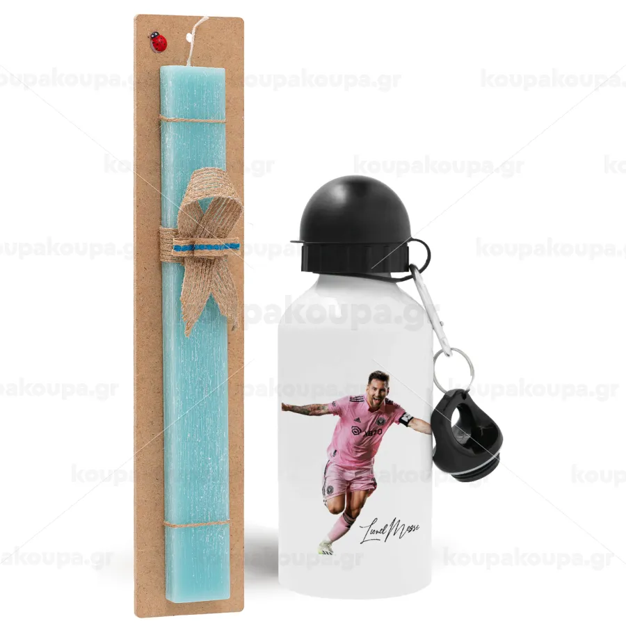 Lionel Messi inter miami jersey, Πασχαλινή Λαμπάδα με παγούρι μεταλλικό αλουμινίου (500ml) & λαμπάδα αρωματική πλακέ (30cm) (ΤΙΡΚΟΥΑΖ)