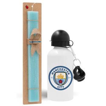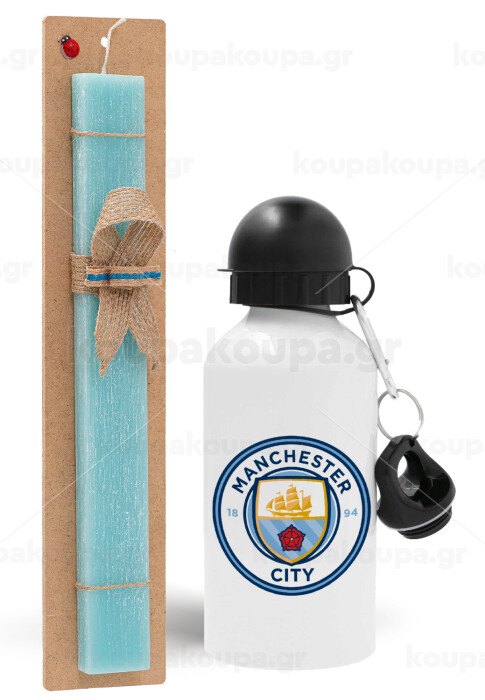 Manchester City FC , Πασχαλινή Λαμπάδα με παγούρι μεταλλικό αλουμινίου (500ml) & λαμπάδα αρωματική πλακέ (30cm) (ΤΙΡΚΟΥΑΖ)