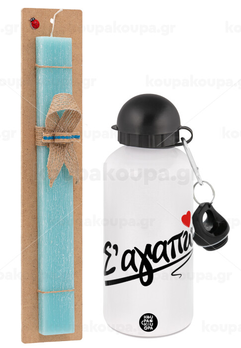 Σ΄ αγαπώ!!!, Πασχαλινή Λαμπάδα με παγούρι μεταλλικό αλουμινίου (500ml) & λαμπάδα αρωματική πλακέ (30cm) (ΤΙΡΚΟΥΑΖ)