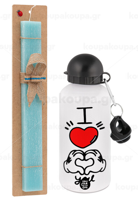 comics hands love, Πασχαλινή Λαμπάδα με παγούρι μεταλλικό αλουμινίου (500ml) & λαμπάδα αρωματική πλακέ (30cm) (ΤΙΡΚΟΥΑΖ)