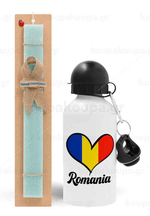 Romania flag, Πασχαλινή Λαμπάδα με παγούρι μεταλλικό αλουμινίου (500ml) & λαμπάδα αρωματική πλακέ (30cm) (ΤΙΡΚΟΥΑΖ)