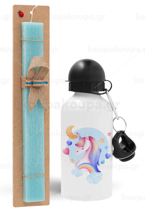 Μονόκερος, Πασχαλινή Λαμπάδα με παγούρι μεταλλικό αλουμινίου (500ml) & λαμπάδα αρωματική πλακέ (30cm) (ΤΙΡΚΟΥΑΖ)