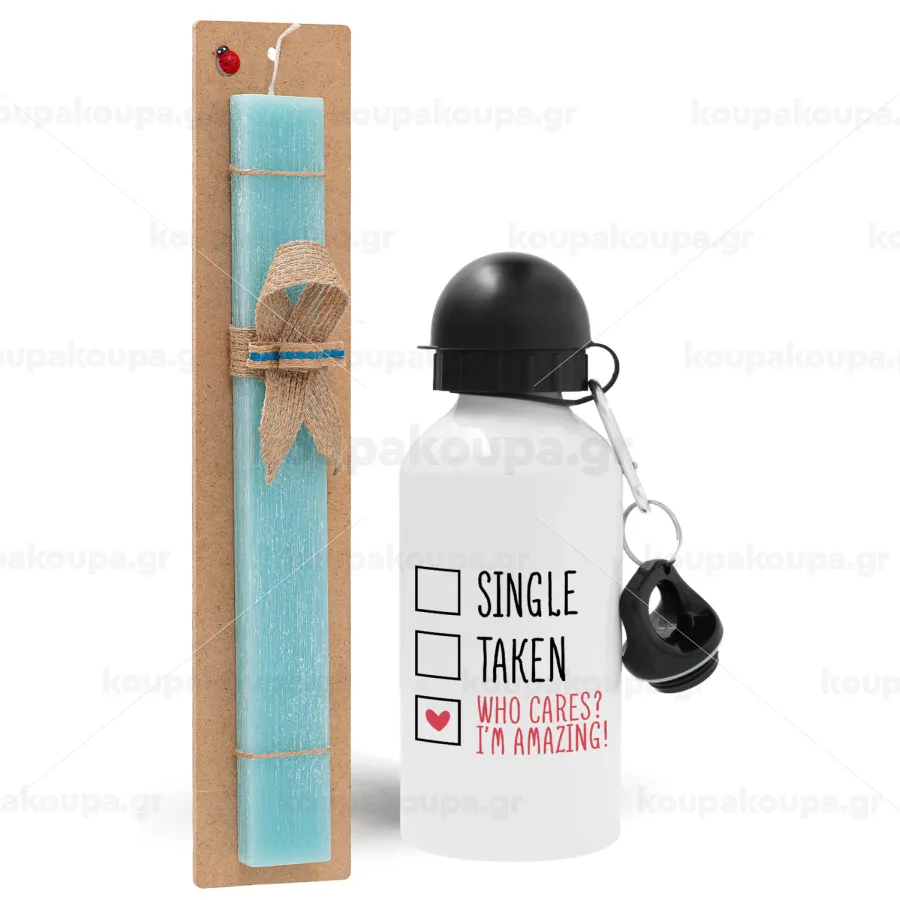 Single, Taken, Who cares i'm amazing, Πασχαλινή Λαμπάδα με παγούρι μεταλλικό αλουμινίου (500ml) & λαμπάδα αρωματική πλακέ (30cm) (ΤΙΡΚΟΥΑΖ)