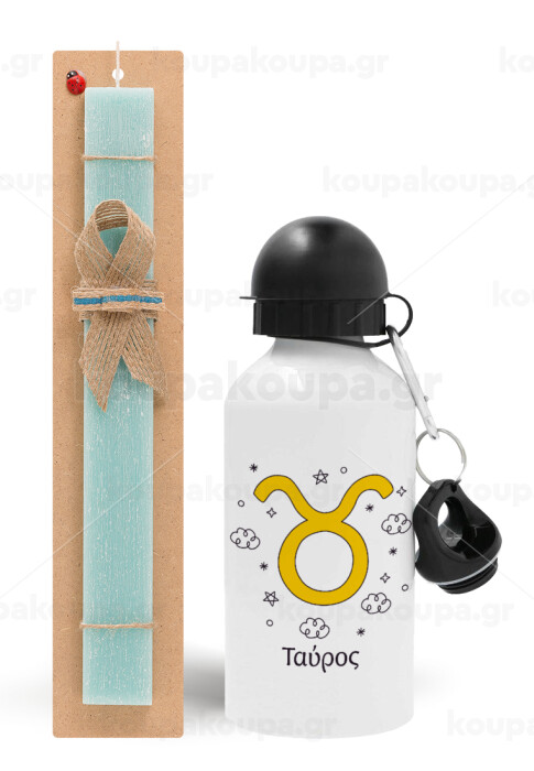 Ζώδια Ταύρος, Πασχαλινή Λαμπάδα με παγούρι μεταλλικό αλουμινίου (500ml) & λαμπάδα αρωματική πλακέ (30cm) (ΤΙΡΚΟΥΑΖ)