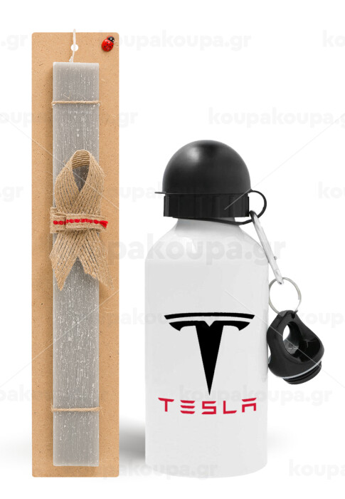 Tesla motors, Πασχαλινή Λαμπάδα με παγούρι μεταλλικό αλουμινίου (500ml) & κερί αρωματικό πλακέ (30cm) (ΓΚΡΙ)