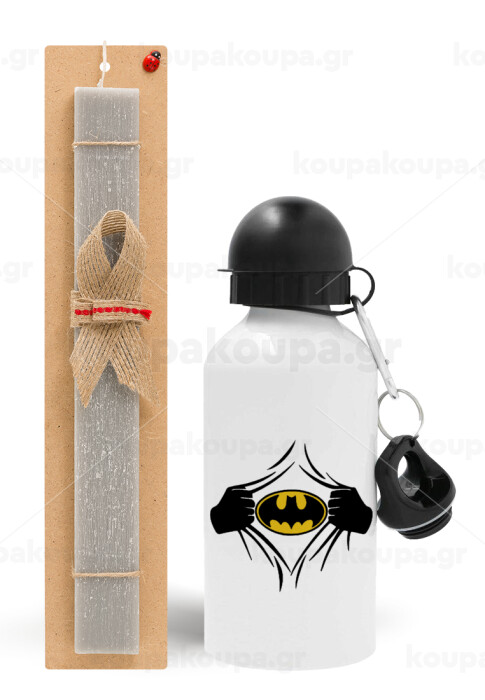 Hero batman, Πασχαλινή Λαμπάδα με παγούρι μεταλλικό αλουμινίου (500ml) & κερί αρωματικό πλακέ (30cm) (ΓΚΡΙ)