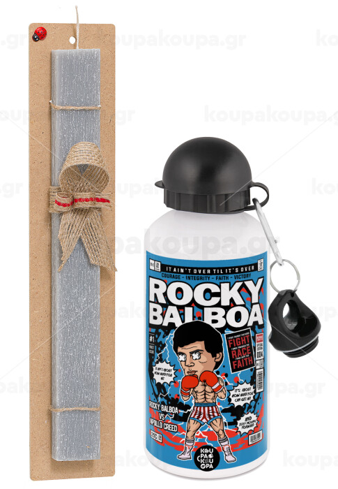 Rocky Balboa, Πασχαλινή Λαμπάδα με παγούρι μεταλλικό αλουμινίου (500ml) & κερί αρωματικό πλακέ (30cm) (ΓΚΡΙ)