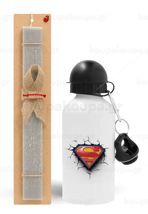 Superman cracked, Πασχαλινή Λαμπάδα με παγούρι μεταλλικό αλουμινίου (500ml) & κερί αρωματικό πλακέ (30cm) (ΓΚΡΙ)
