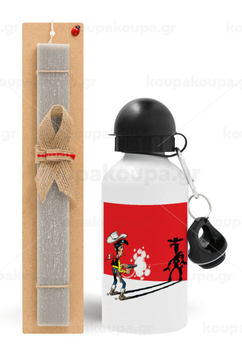 Λούκυ Λουκ σκιές, Πασχαλινή Λαμπάδα με παγούρι μεταλλικό αλουμινίου (500ml) & κερί αρωματικό πλακέ (30cm) (ΓΚΡΙ)