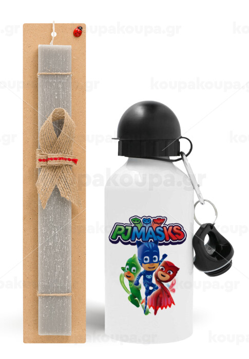 PJ masks, Πασχαλινή Λαμπάδα με παγούρι μεταλλικό αλουμινίου (500ml) & κερί αρωματικό πλακέ (30cm) (ΓΚΡΙ)
