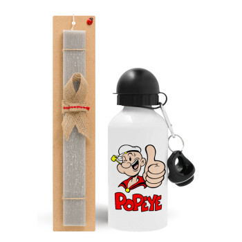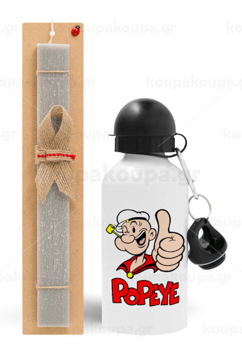 Popeye the sailor man, Πασχαλινή Λαμπάδα με παγούρι μεταλλικό αλουμινίου (500ml) & κερί αρωματικό πλακέ (30cm) (ΓΚΡΙ)