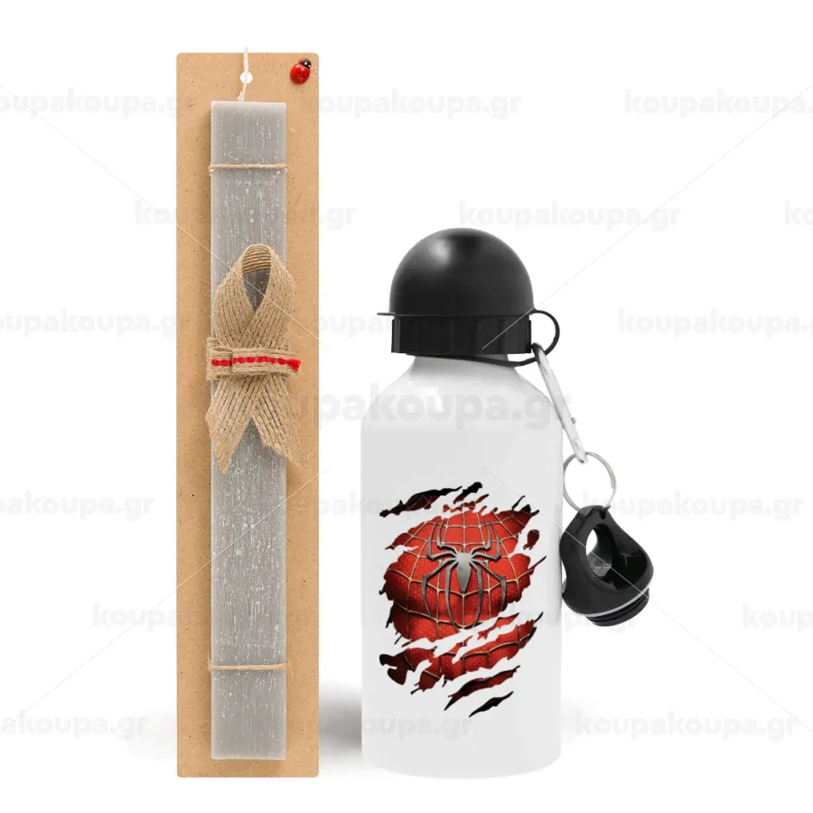 Spiderman cracked, Πασχαλινή Λαμπάδα με παγούρι μεταλλικό αλουμινίου (500ml) & κερί αρωματικό πλακέ (30cm) (ΓΚΡΙ)
