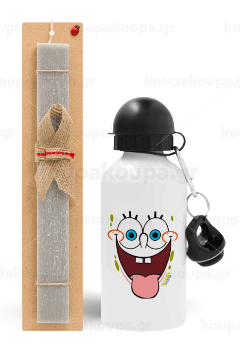 Μπομπ Σφουγγαράκης χαμόγελο, Πασχαλινή Λαμπάδα με παγούρι μεταλλικό αλουμινίου (500ml) & κερί αρωματικό πλακέ (30cm) (ΓΚΡΙ)