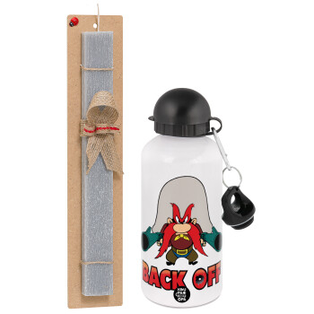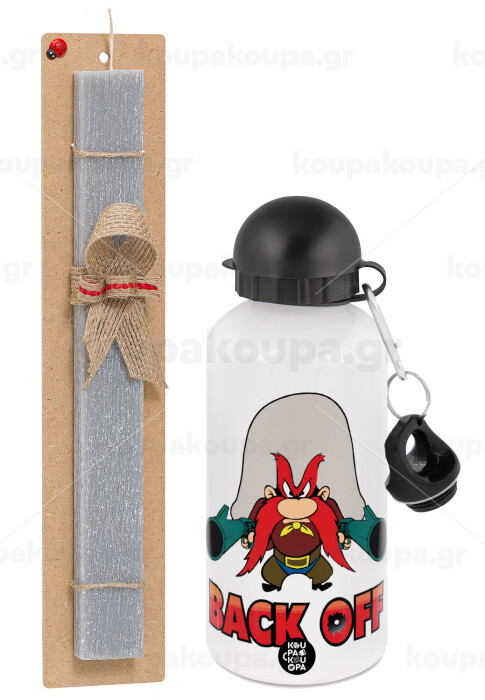 Yosemite Sam Back OFF, Πασχαλινή Λαμπάδα με παγούρι μεταλλικό αλουμινίου (500ml) & κερί αρωματικό πλακέ (30cm) (ΓΚΡΙ)